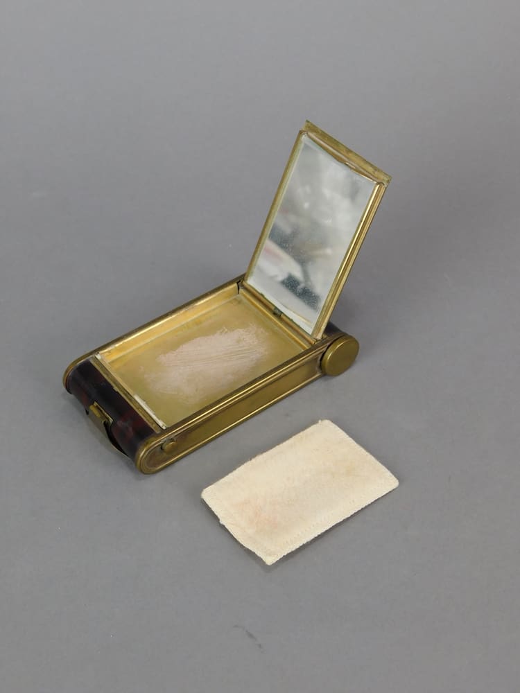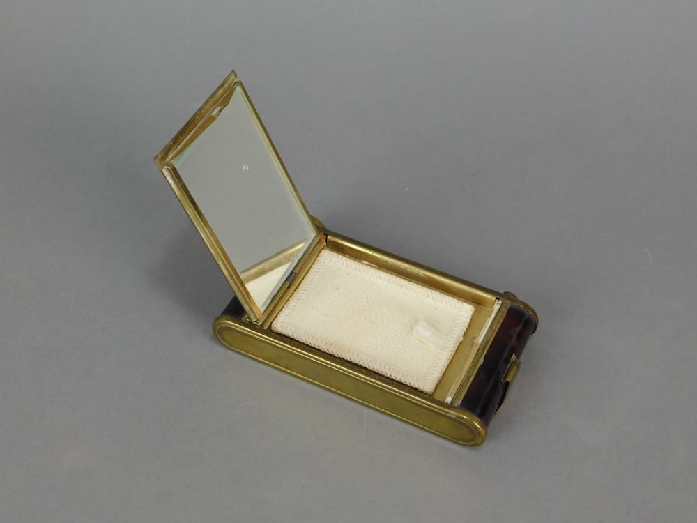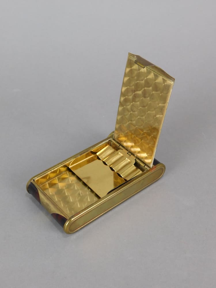 A gilt and tortoiseshell effect camera compact with internal mirror, original powder puff, lipstick holder and machined gilt cigarette holder section. More pics available on request.