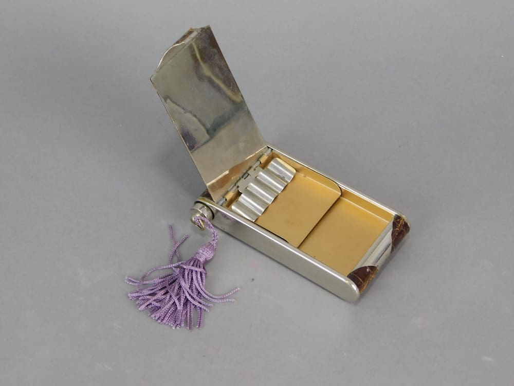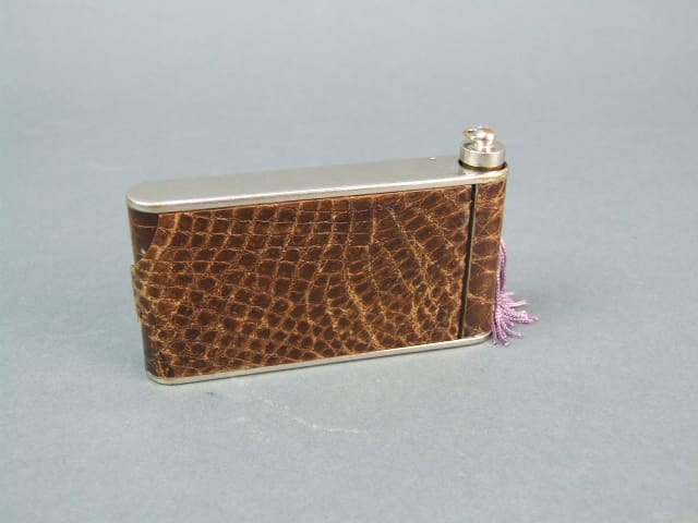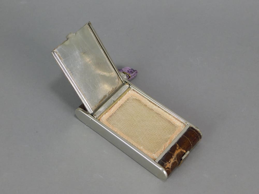 Snakeskin effect leather compact with lipstick holder to the end and cigarette holder in the bottom of the base. Inside is the original mesh with a reflective lid with some foxing.