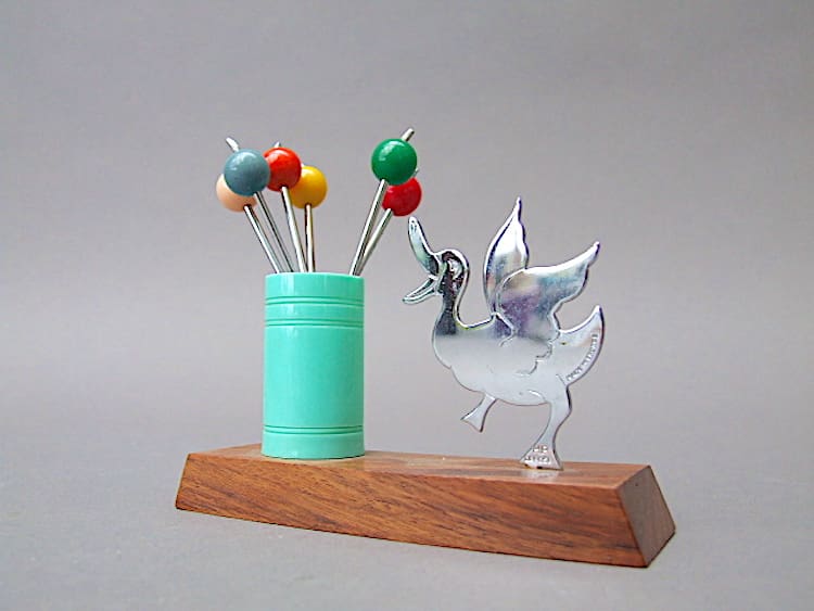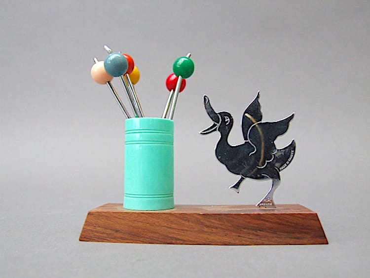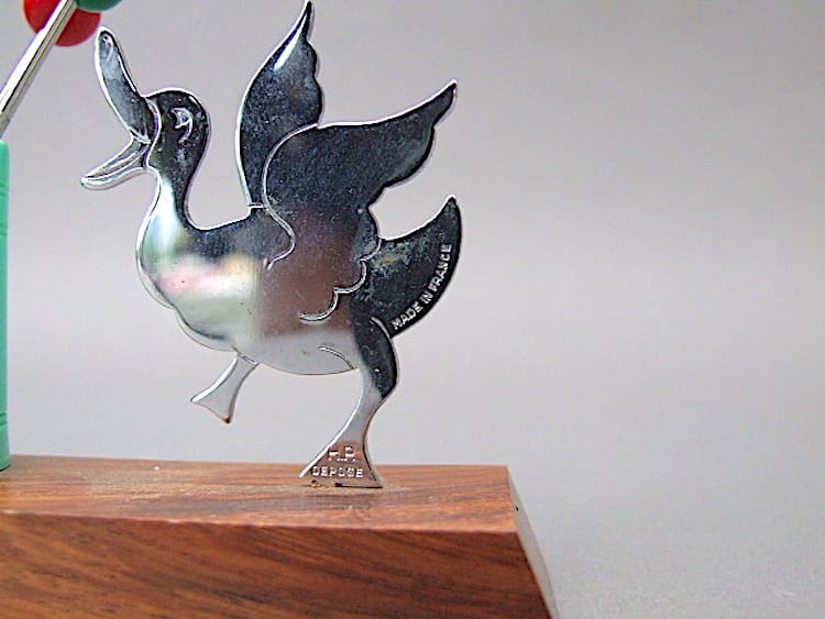 I believe this cute two dimensional chrome duck cocktail sticks set is by Benjamin Rabier.
