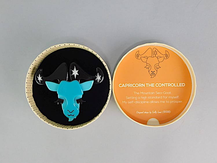 Capricorn the controlled brooch by Erstwilder. Fitted with a roll safety clasp. Comes in its original box with teapot tag and stamped with the Erstwilder bluebird to the reverse.