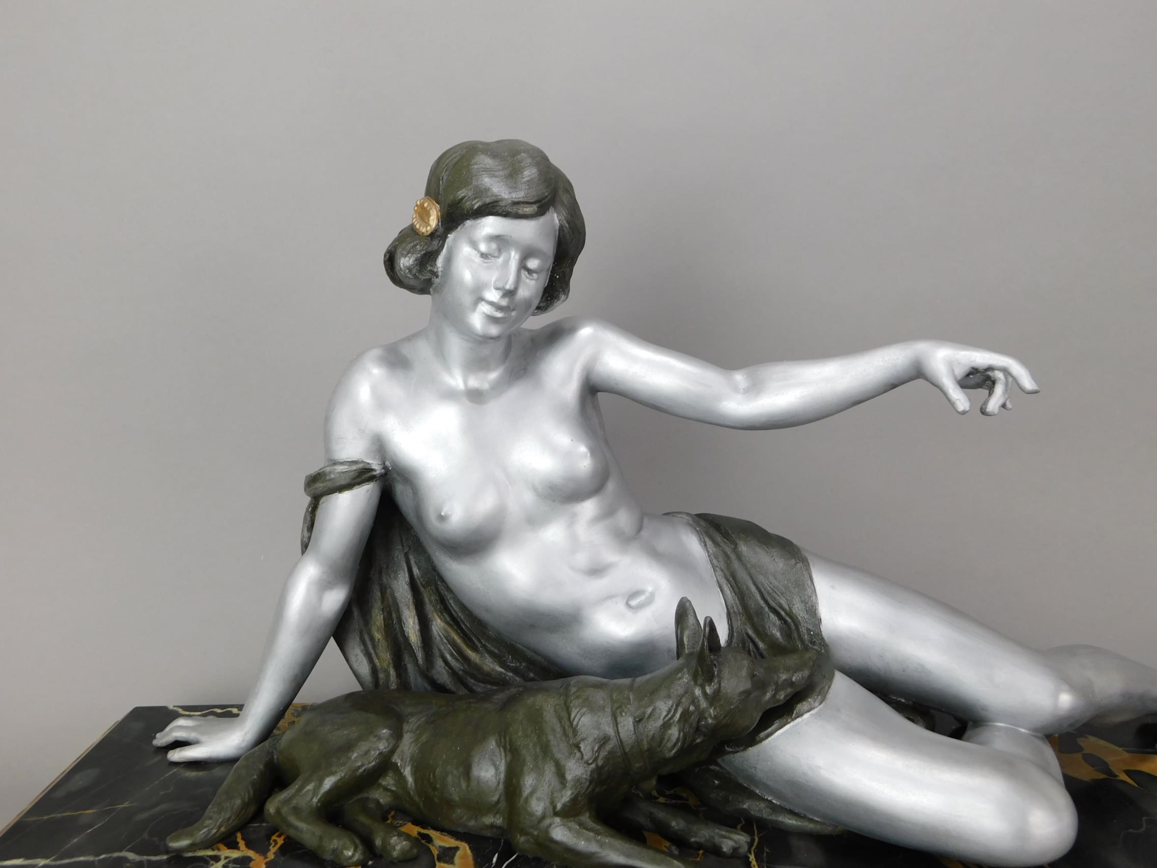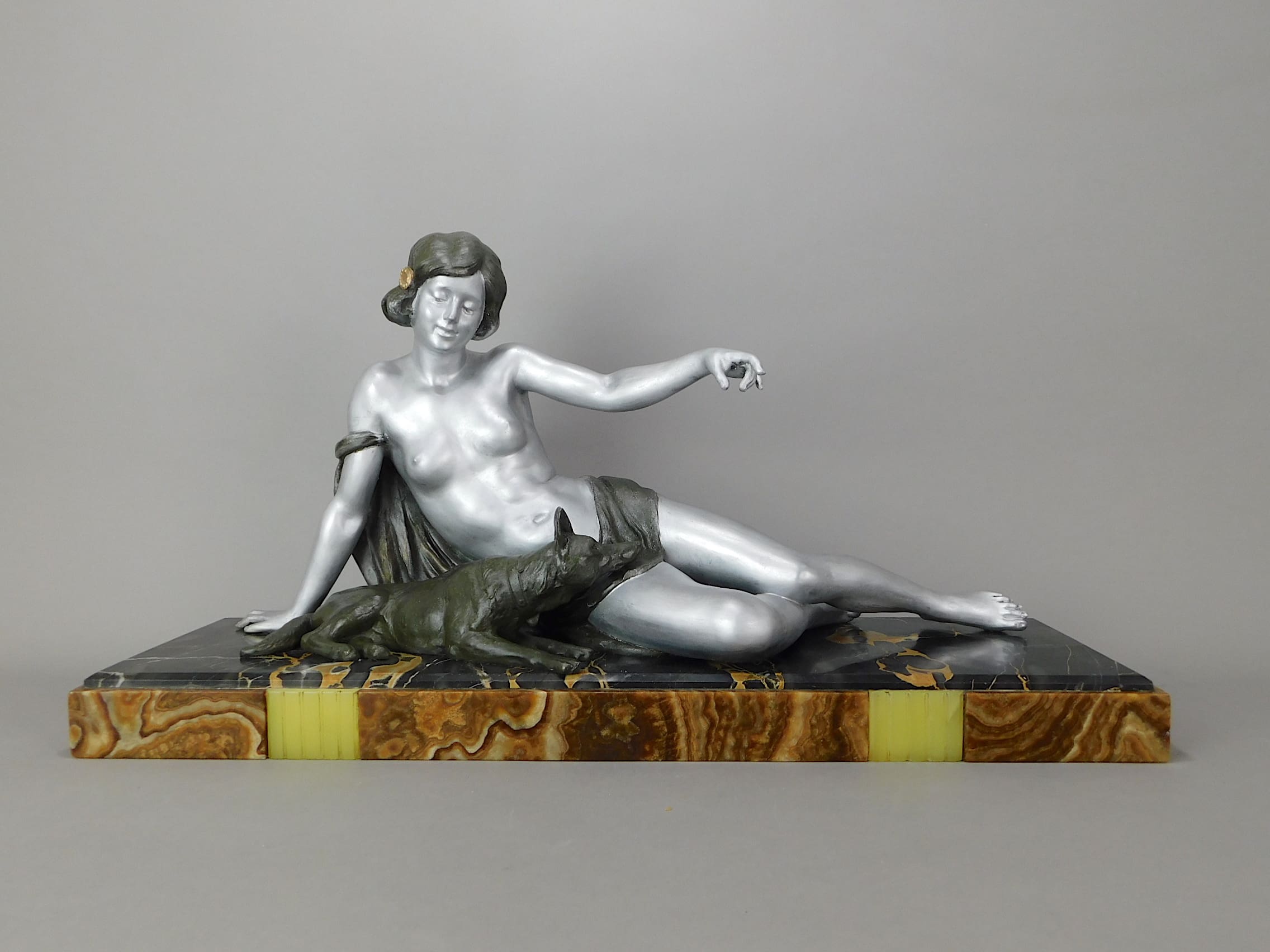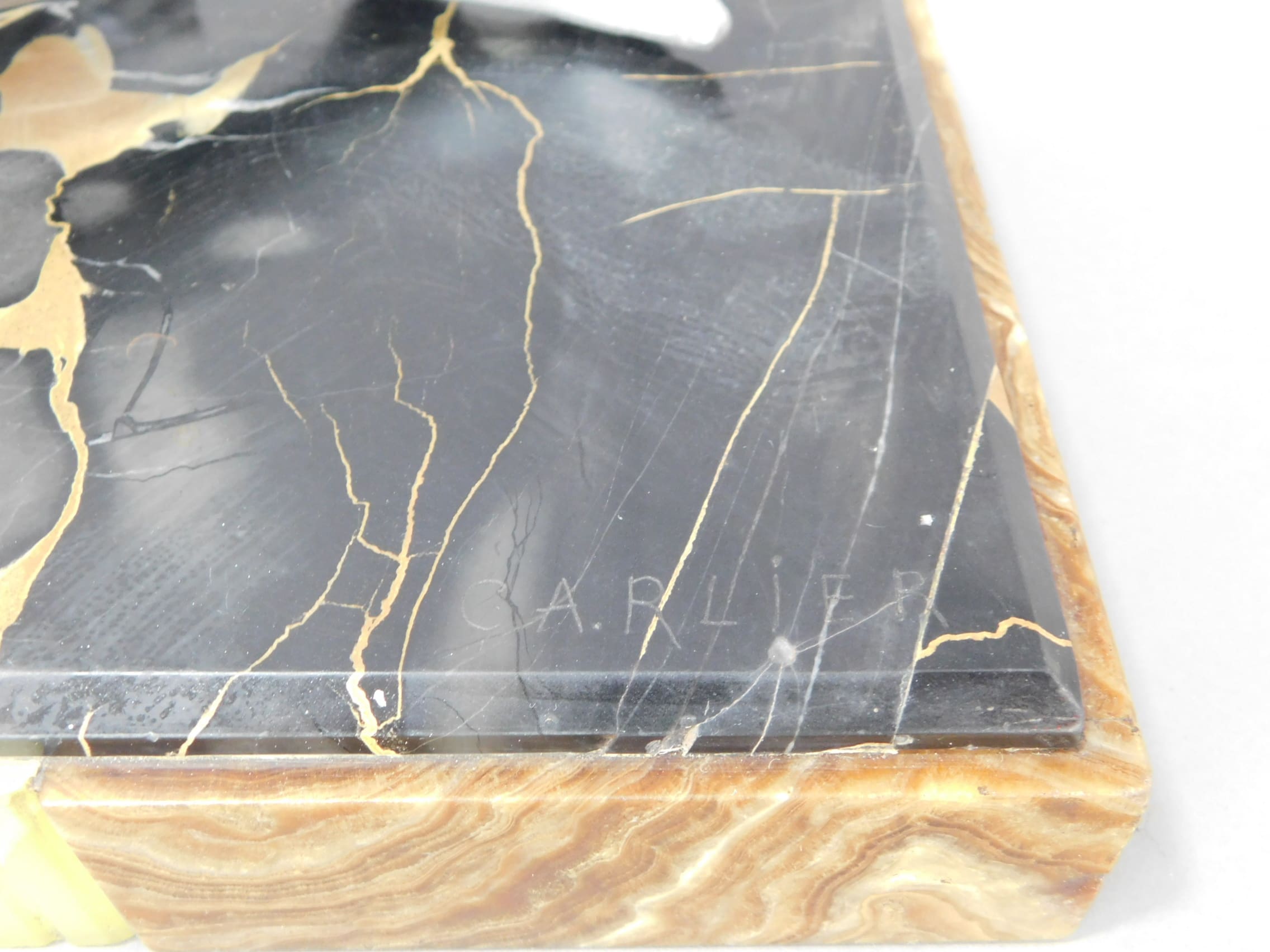 It is mounted on a portorro marble, brown and green onyx base and signed on the right hand end.