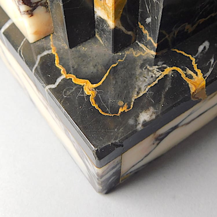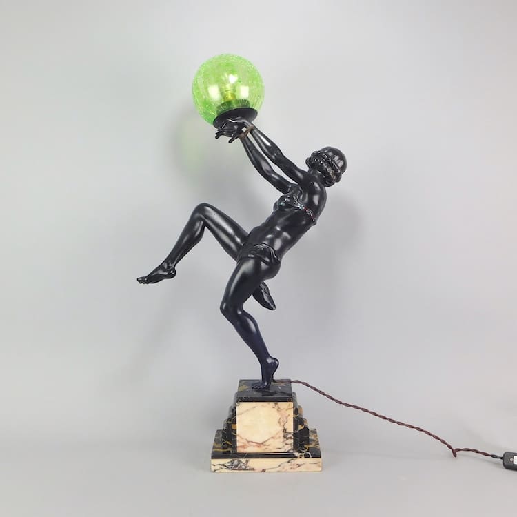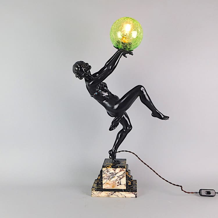 A very large lady lamp, standing on a stepped marble base of portorro and purple marble. She appears to have been rewired as the wiring and fitments are new. Clearly signed Carlier to the marble. The green crackle glass globe shade is held with crocodile clips.