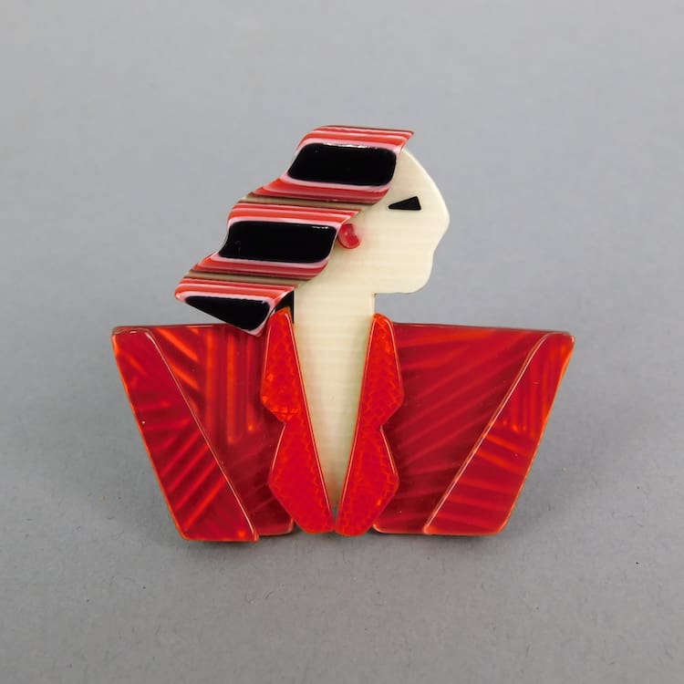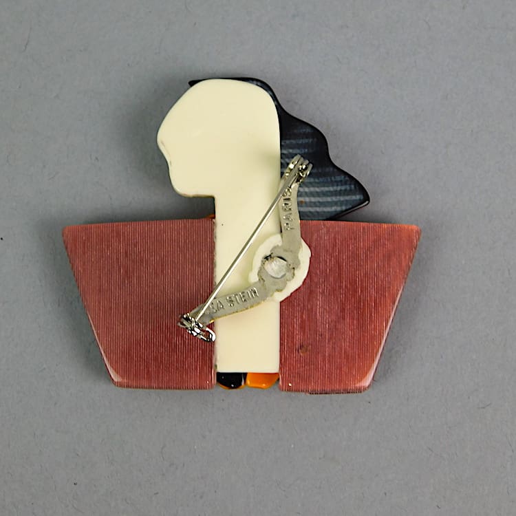 Vintage Carmen, or Joan Crawford, brooch as seen in the Lea Stein book p25. Fitted with the usual signed safety clasp. 2.25 inches (5.5cm) wide. In as-new condition.