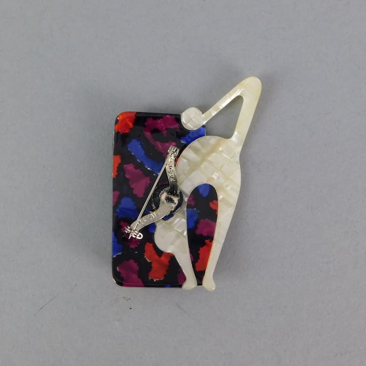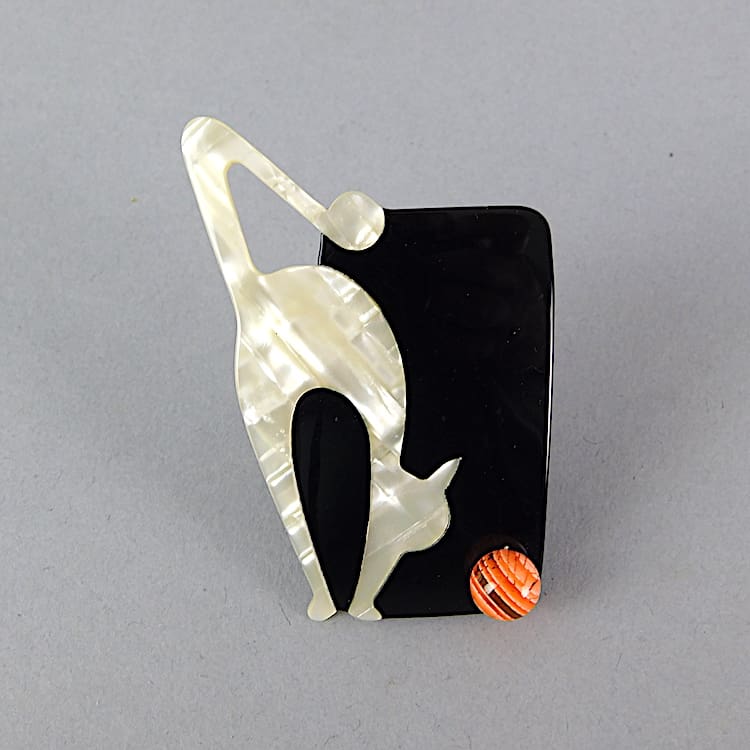 Glittery cat and ball brooch. Signed on the safety V clasp. First produced in the 1990’s. In new condition. 2.75 inches wide (7cm). Ref: The Lea Stein book p48.