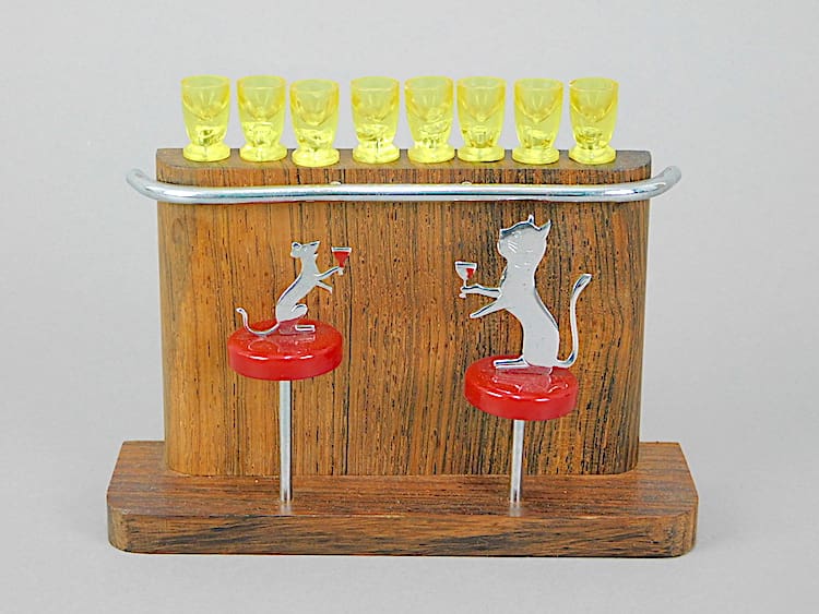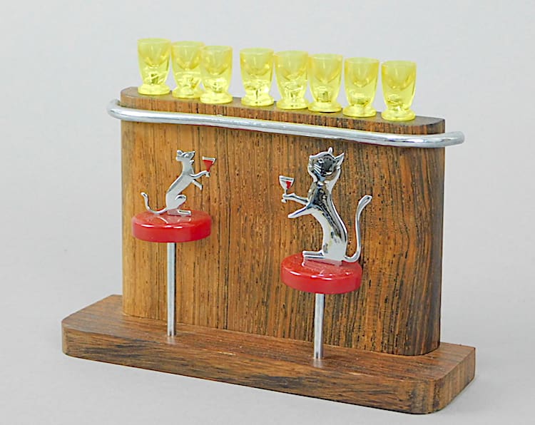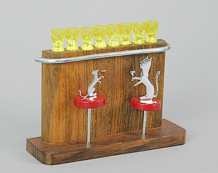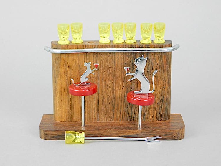 French art deco cocktail sticks set, modelled as a cat and a mouse drinking cocktails at a bar. An unsigned Sudre. With 8 lucite glasses which are cocktail sticks in the top of the bar. Mounted on a rosewood wooden base.