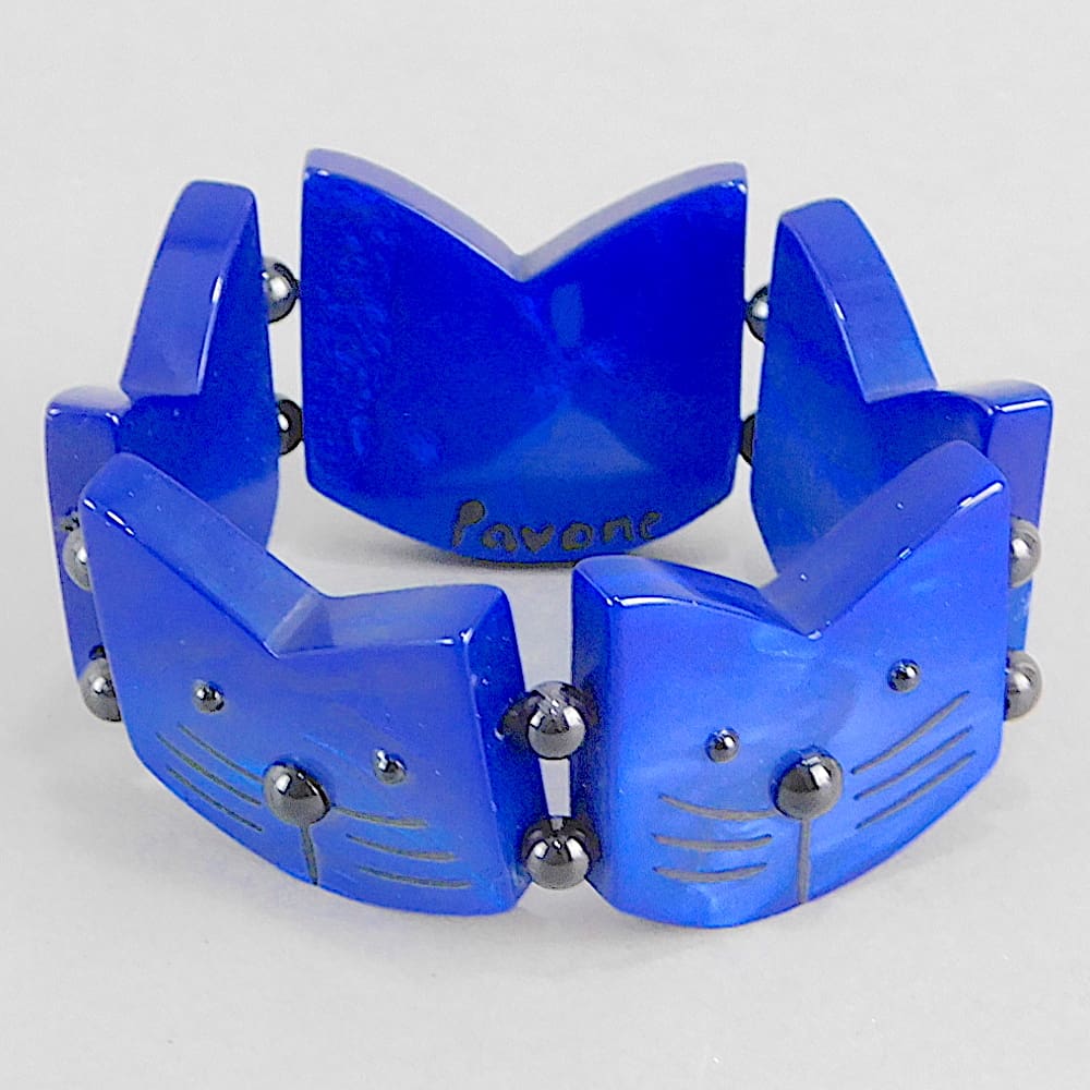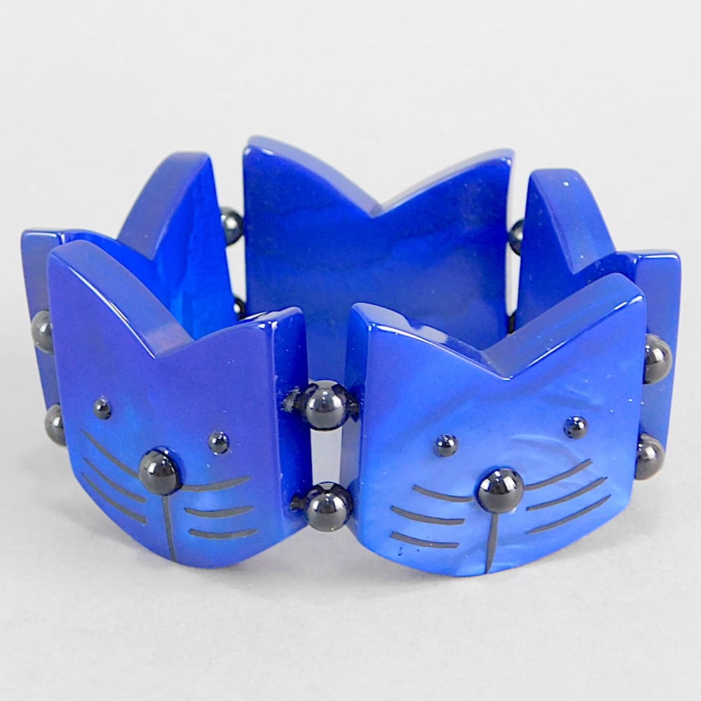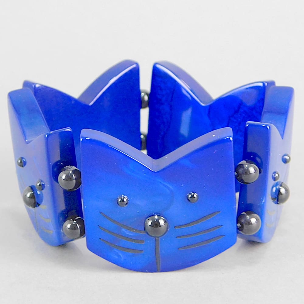 Cat Bangle deco navy blue galalith hand painted cat head bracelet. Made by Marie-Christine Pavone and signed on the inside panel, it is elasticated and will fit a small to medium sized wrist comfortably.