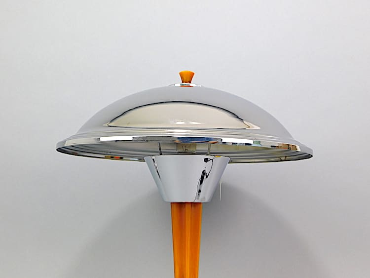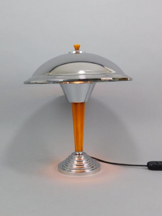 English art deco modernist table lamp by Cavacraft with ribbed bakelite stem. Domed chromed metal shade.