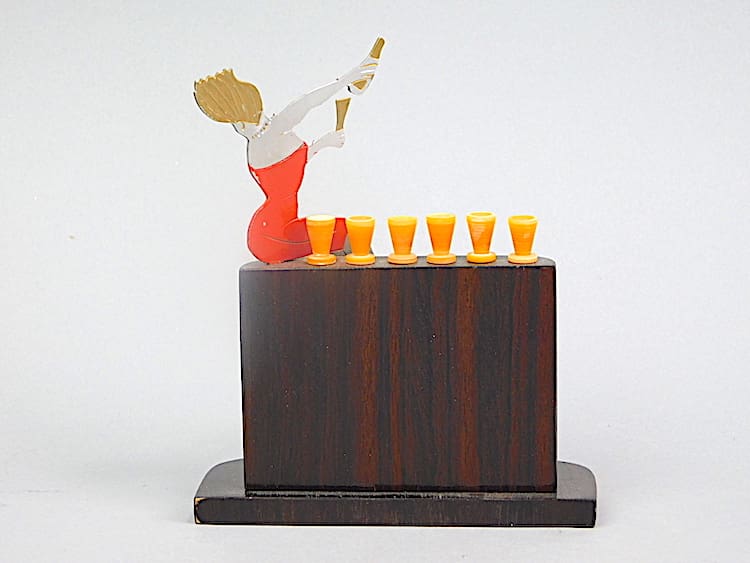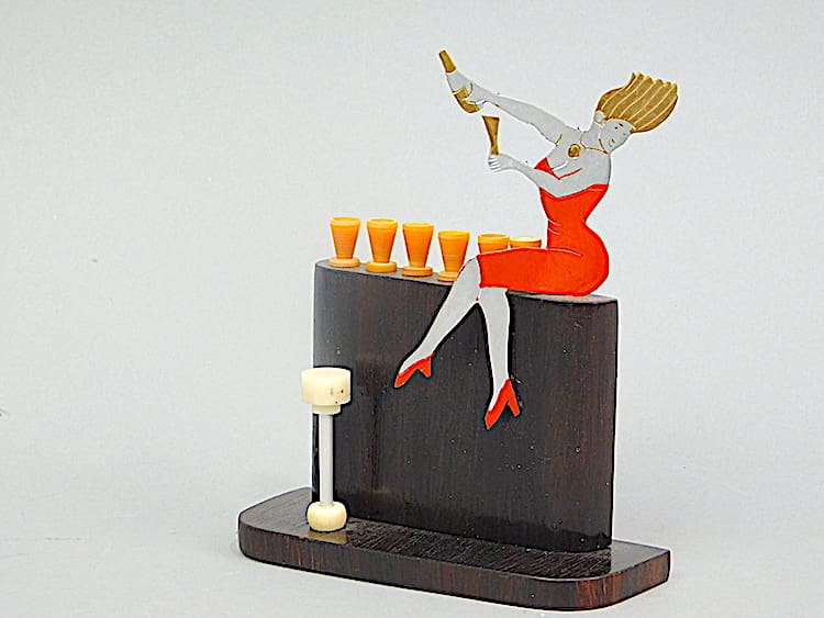 French art deco hand painted woman sitting on a rosewood bar celebrating with champagne.