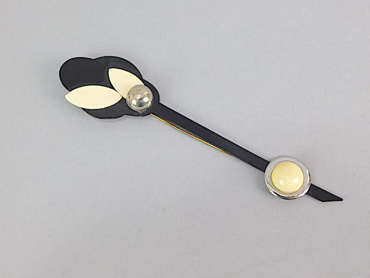 Rare Cream and black celluloid veneer and chrome hat pins.