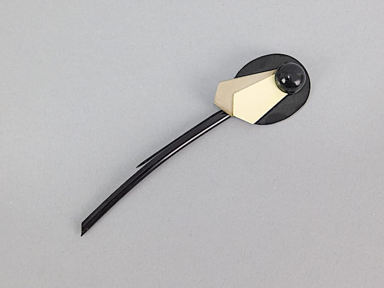 Rare Cream and black celluloid veneer and chrome hat pin.
