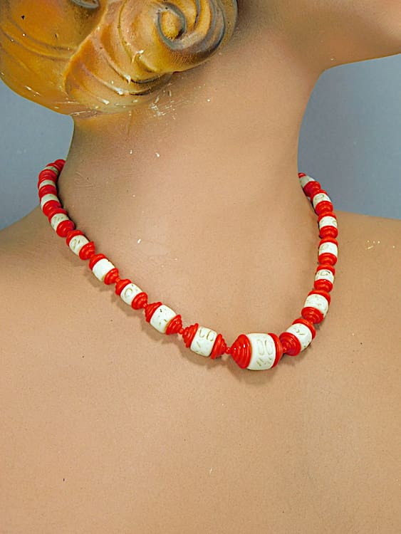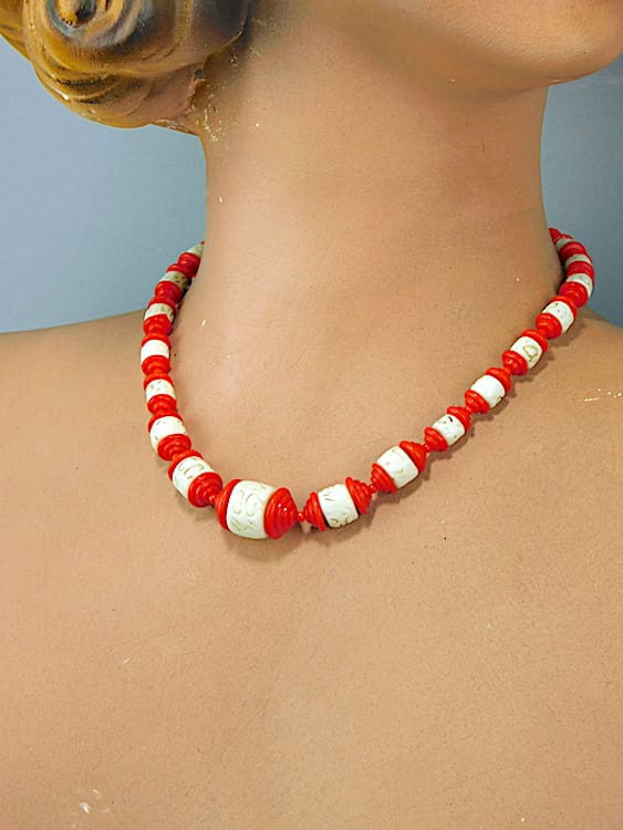 Chinese influence lantern type necklace, made in the 1930’s of red and cream patterned celluloid.