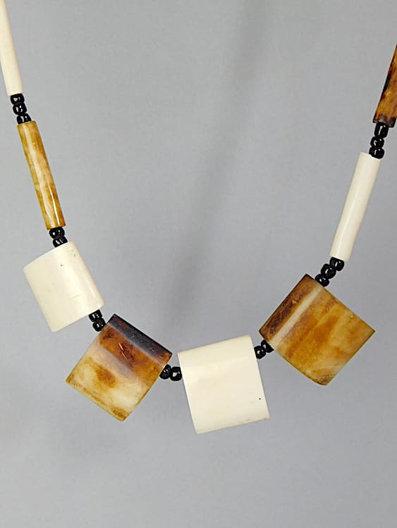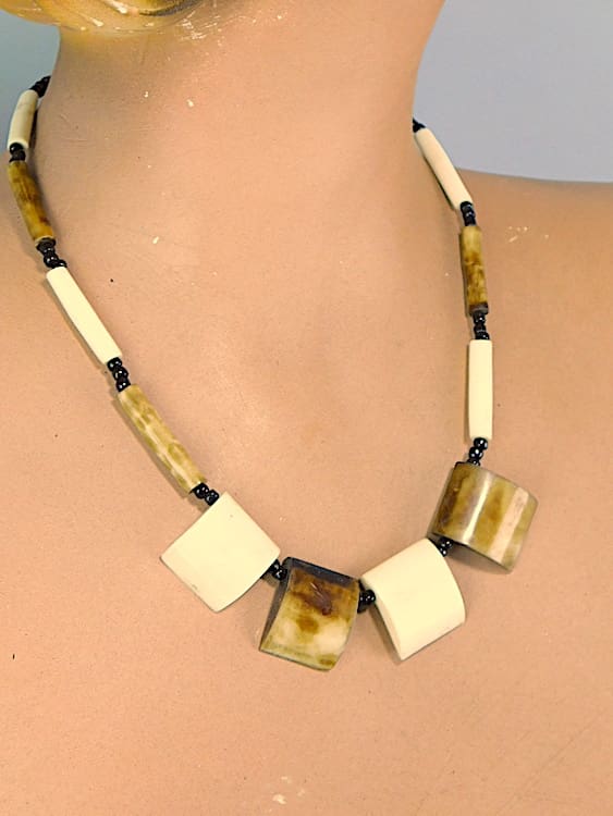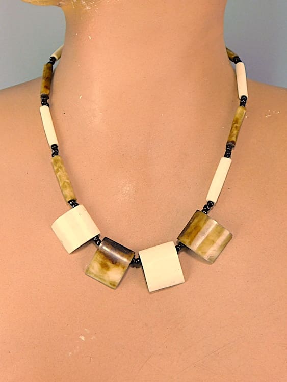 Cream and brown celluloid necklace. Fitted with a screw clasp.