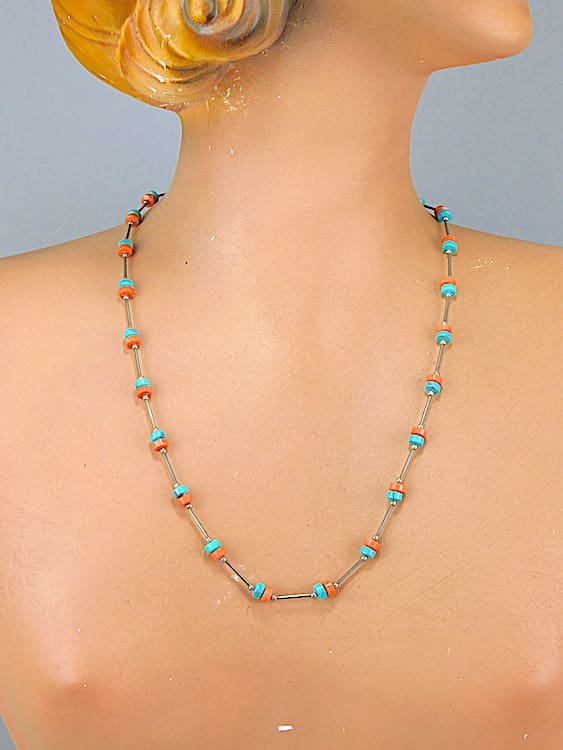 1920’s necklace with pink and turqoise celluloid rings. Fitted with a screw clasp.
