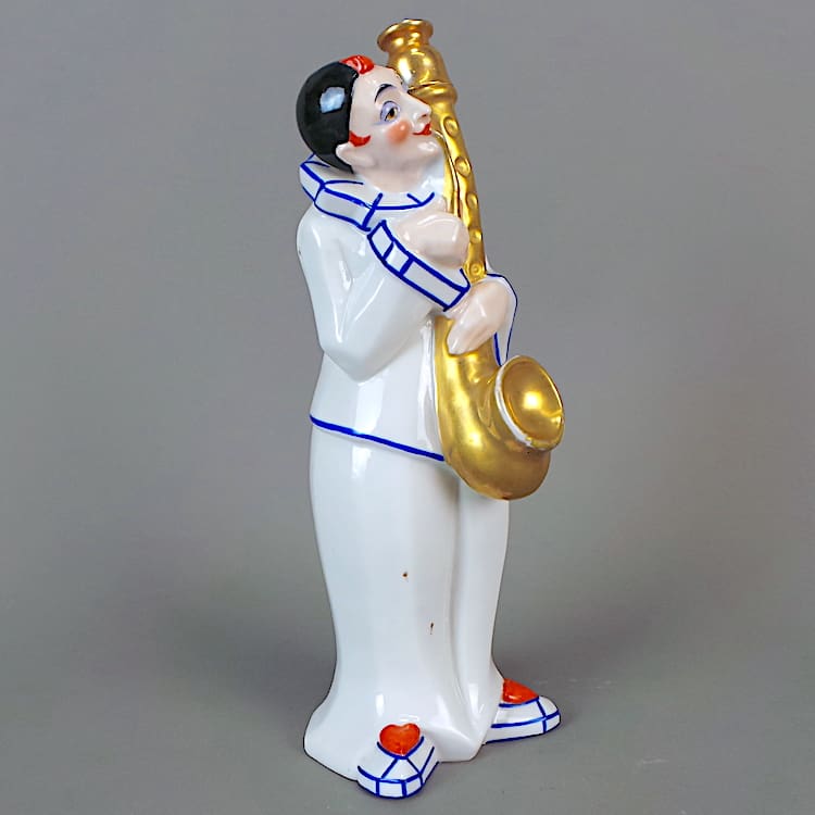Hand painted German art deco ceramic clown atomiser playing a saxophone – currently not usable but could possibly be restored to working condition. Sold as a collectible item.