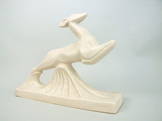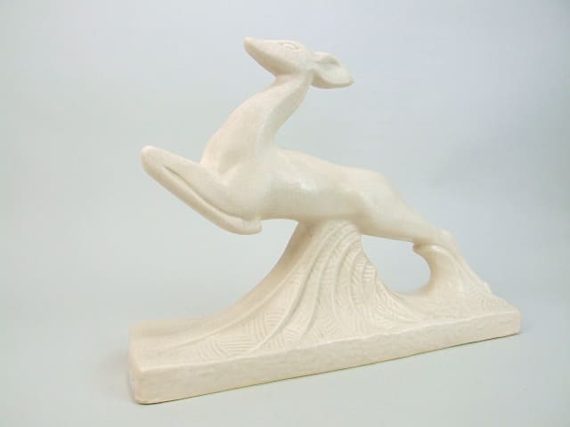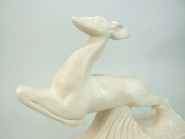 An art deco craquelier leaping deer ceramic statue. Signed to the base Cassin and produced by Moulin des loops company in France in the 1920s. Cassin was also a famous landscape artist in the late 1920s.