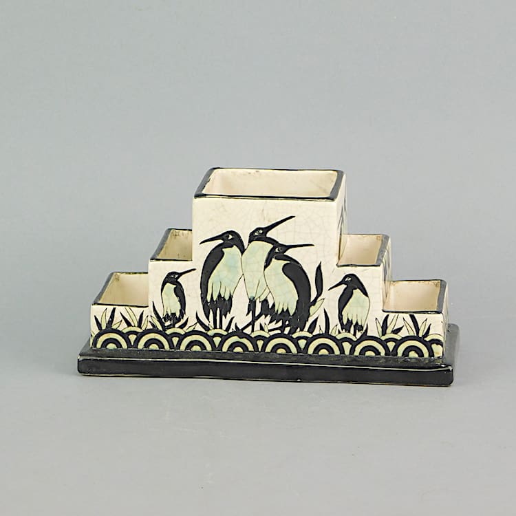 Nicely decorated desk tidy in pale blue and black – a more recent piece in the style of Boch Keramis, but this one signed Keralouve.