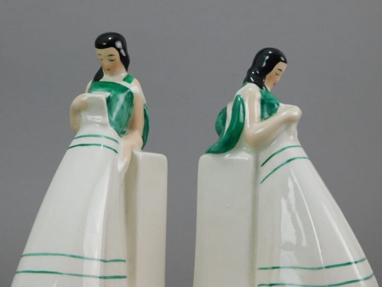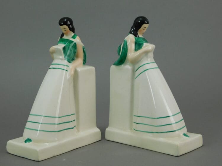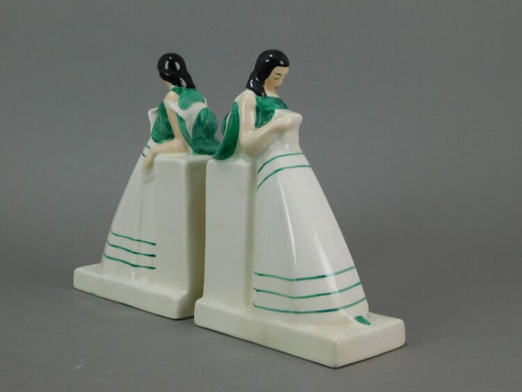 A pair of stylised, hand painted French lady bookends, very much in Robj style and quality but these unsigned. They have impressed numbers under the base but unfortunately are indistinct.
