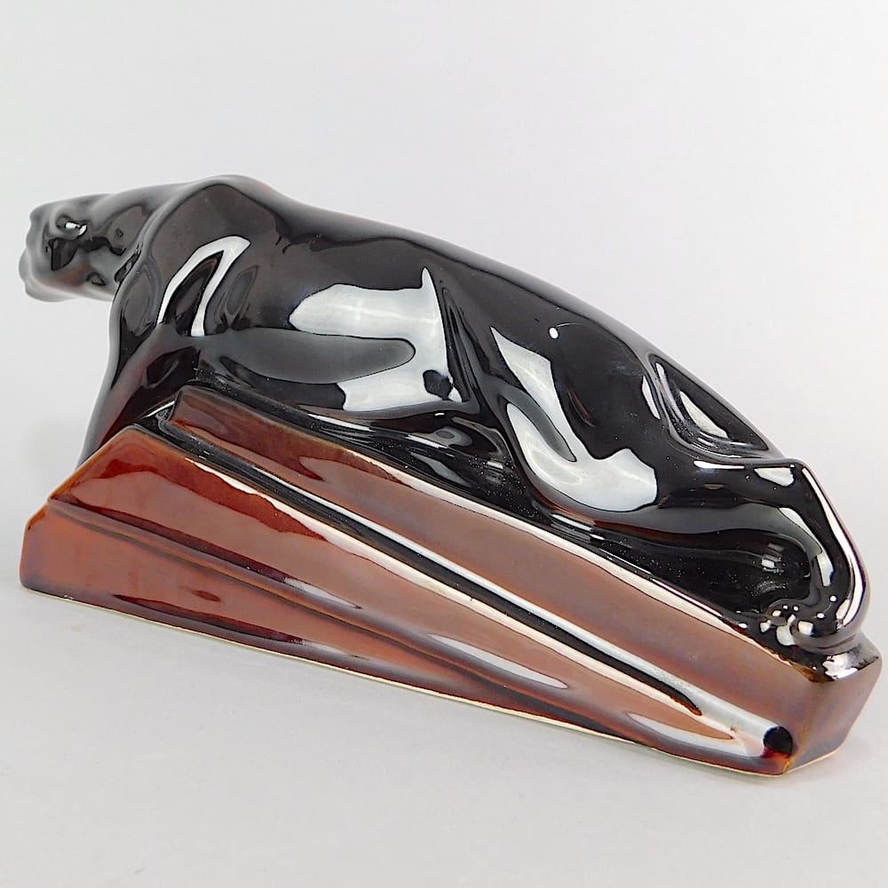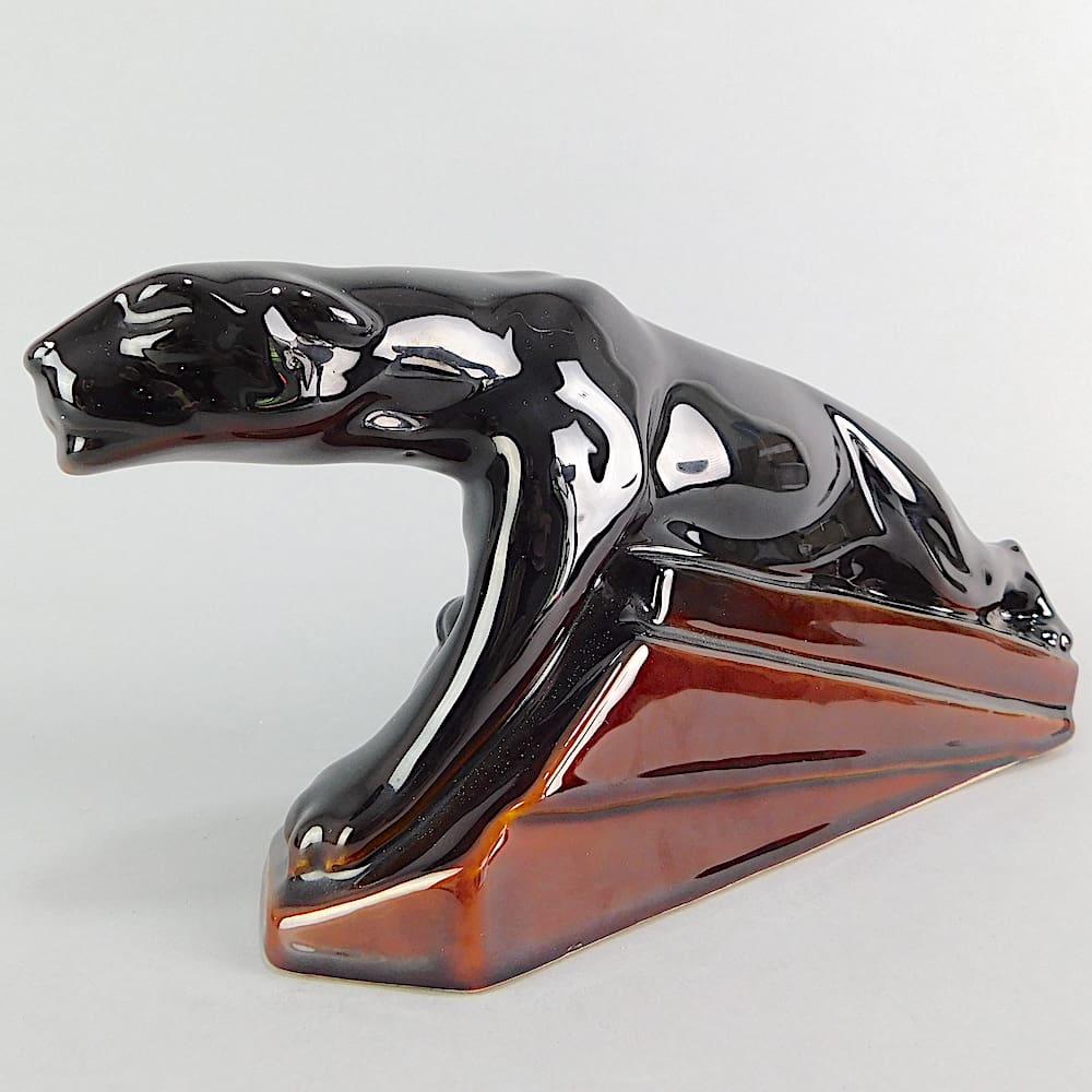 French Art Deco ceramic panther. Black glazed panther on a brown glazed base. Possibly by Lemenceau but unsigned.