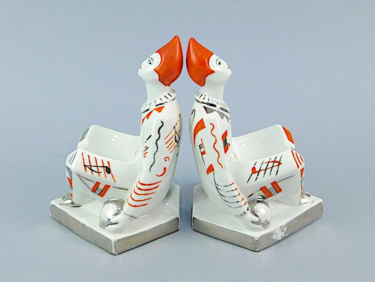 A beautiful pair of hand painted ceramic perfume lamps in the form of a pair of clowns looking at each other comically. Unmarked but possibly Limoge. Both have the holes for a bulb holder and wiring, but the original parts are missing.