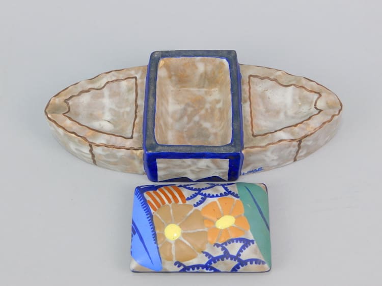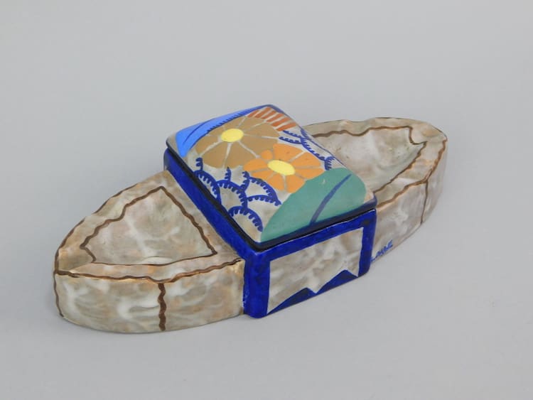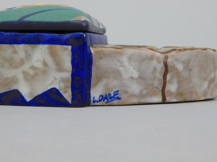 French, deco period, centrally lidded smokers box with ashtray at either end. Very much in the style of Amphora with lovely hand painted, stylised floral lid and mottled grey and brown body. Signed by the artist, L. Dage.