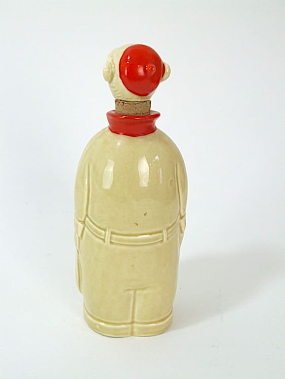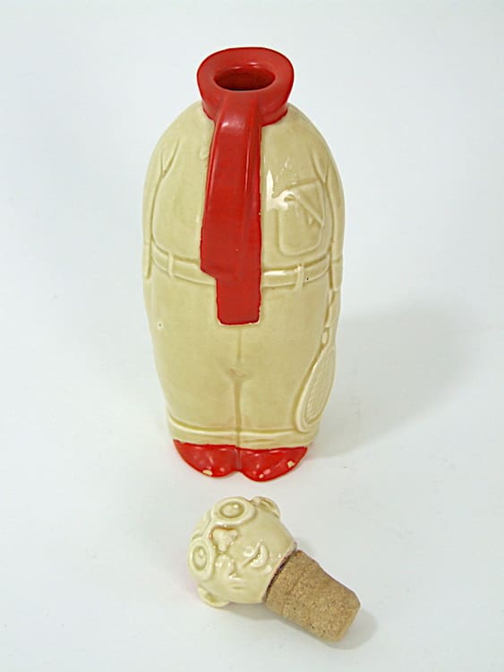 German ceramic bottle designed as a man holding a tennis racket and marked Foreign under the base.