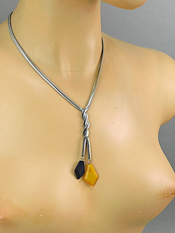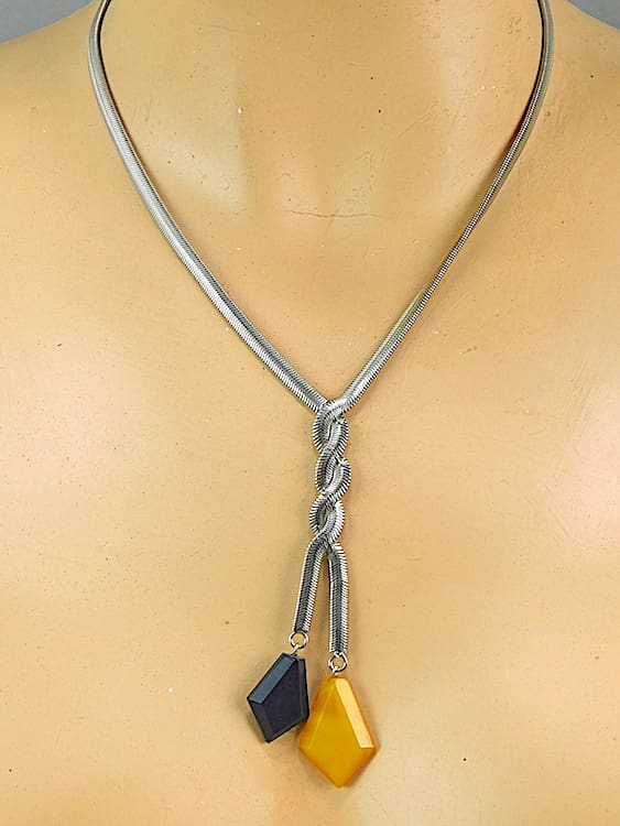 Yellow and black galalith and chrome snake chain necklace by Jakob Bengel.