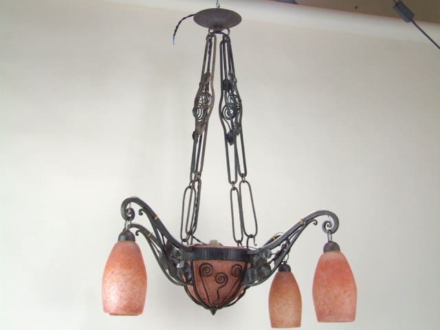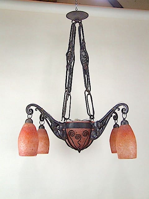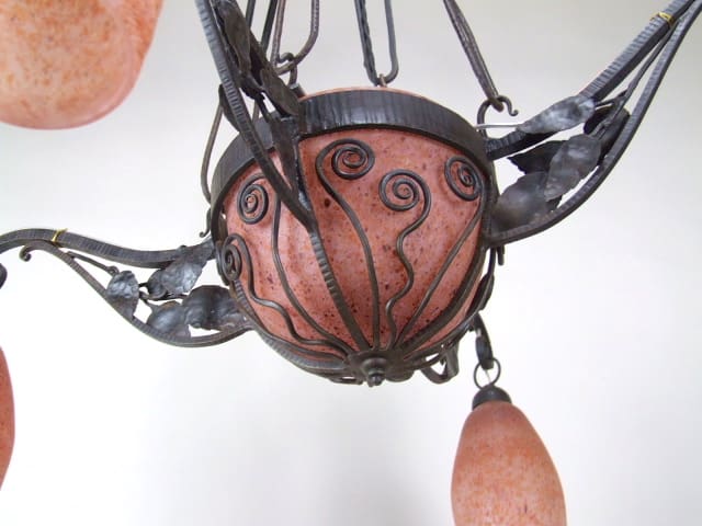 French art deco pate de verre ceiling lamp with wrought iron frame in the style of Edgar Brandt. Chain linked hangers so can be hung at different heights. Unsigned glass but known to be Daum as I have seen one signed.