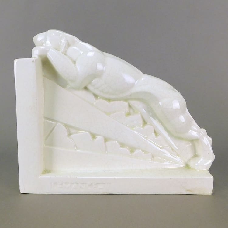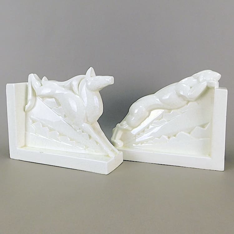 Large rare French Art Deco cream ceramic crackle glaze bookends. One each of a panther chasing a deer over sunray zig zag base.