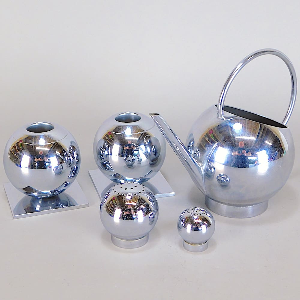 Consists of cruet set, candle holders and water jug and all items except the tray bear the Chase mark.