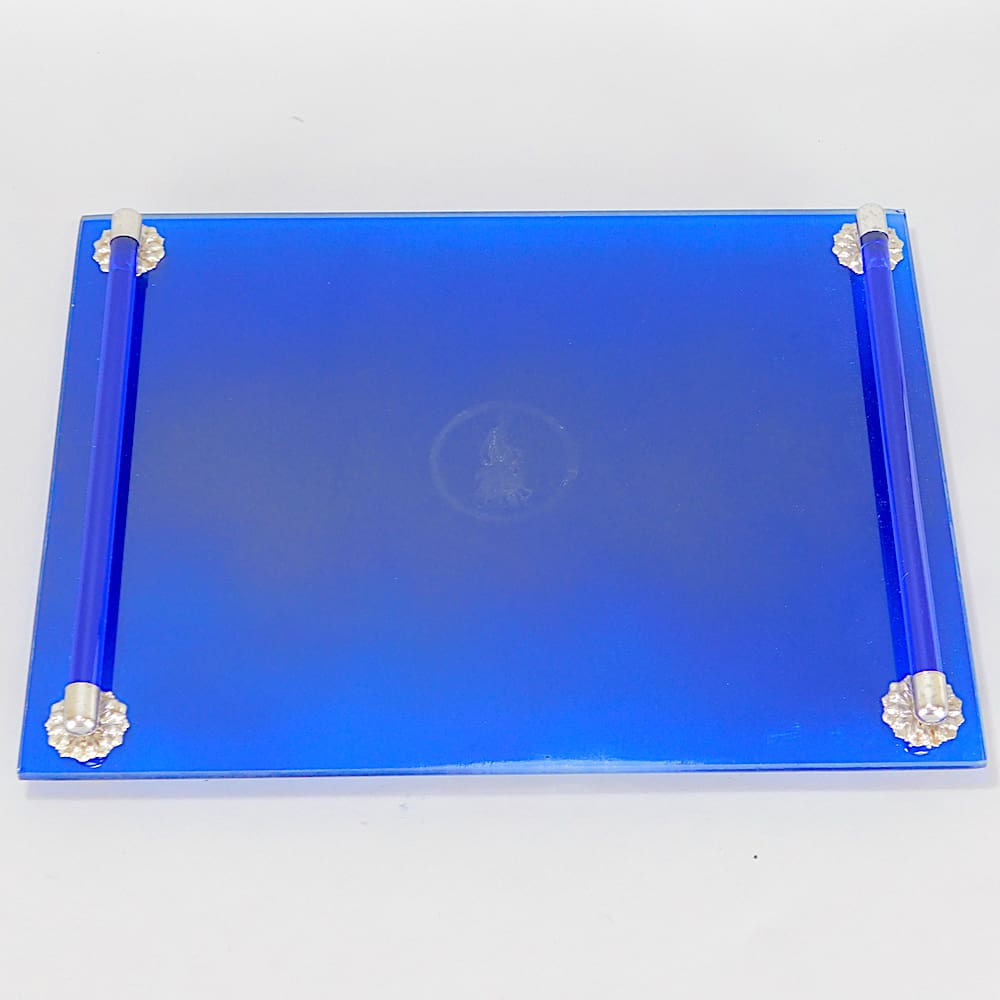 American chrome set by Chase on an electric blue mirror glass tray with glass rod handles and chrome mounts and with a faded silvered logo to the centre of Diana the Huntress.