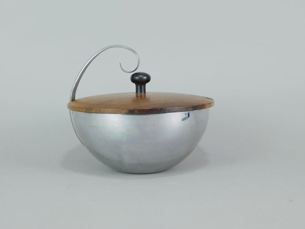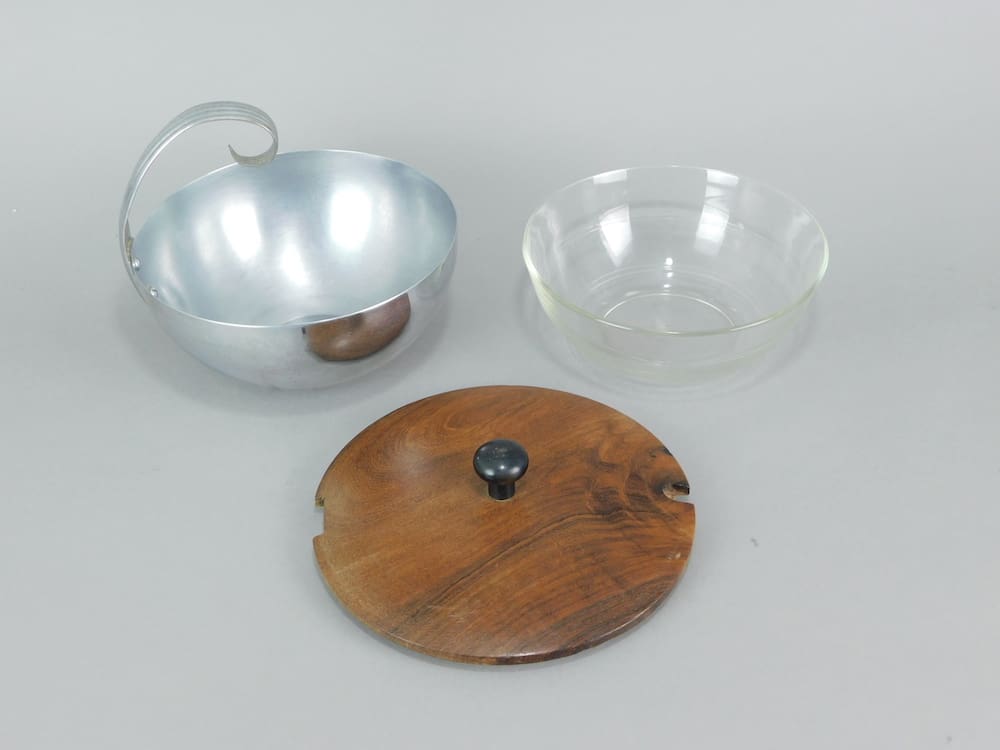 Modernist glass lined wood lidded chrome server dish by Chase of USA. The glass insert may not be the original.