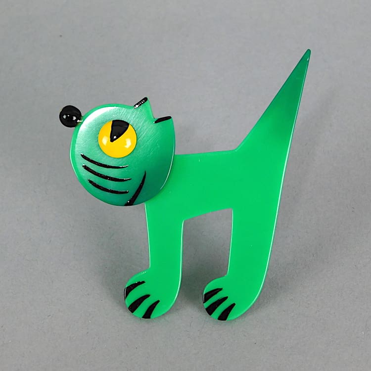 French vintage bakelite hand made and painted cat brooch by Marie-Christine Pavone. Signed to the back and fitted with a roll safety clasp.
