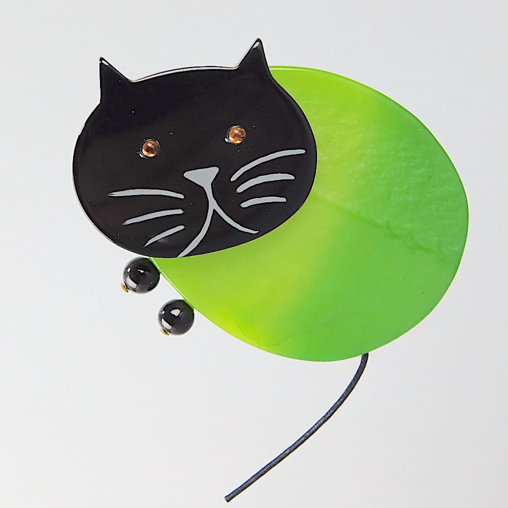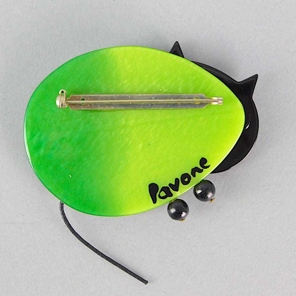 Green galalith cat brooch by Pavone. Fitted with a roll safety clasp and signed by Pavone to the rear.