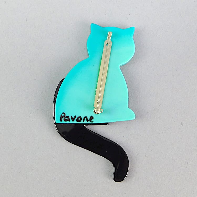 French vintage galalith hand made and painted cat brooch by Marie-Christine Pavone. Hand signed to the reverse and fitted with a roll safety clasp.