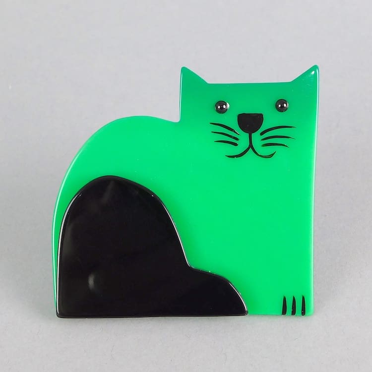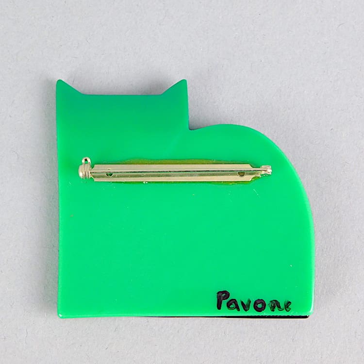 French vintage galalith hand made and painted cat brooch by Marie-Christine Pavone. Signed to the reverse and fitted with a roll safety clasp.