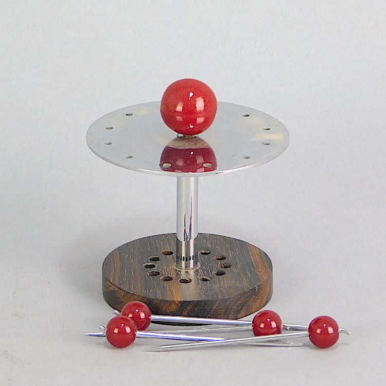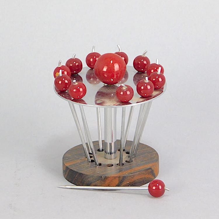 French Macassar and chrome cocktail stick set with prong fork ends. Mounted on a Macassar base. 12 sticks.