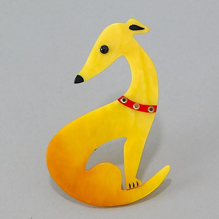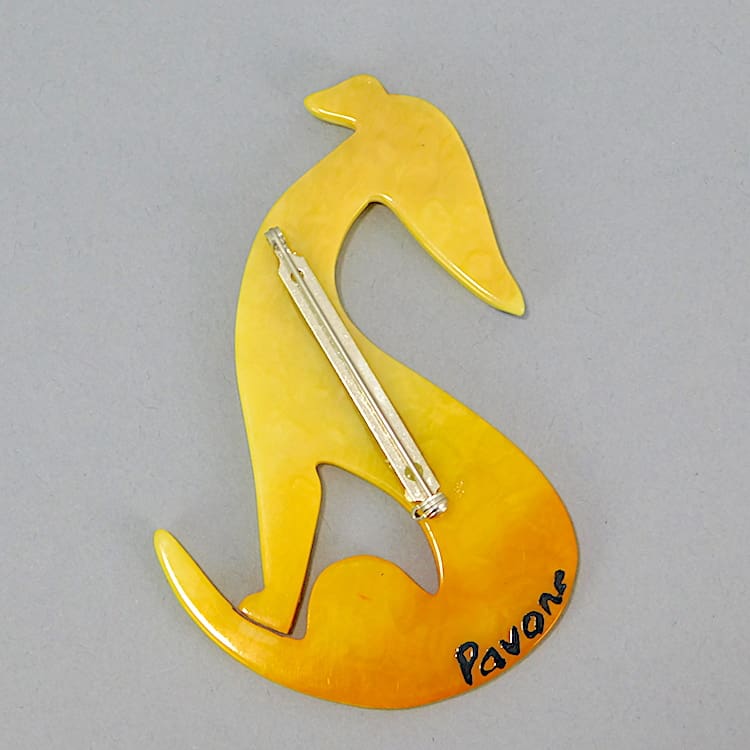 French vintage galalith hand made and signed brooch by Marie-Christine Pavone. It has diamonte collar detail. Fitted with a roll safety clasp.