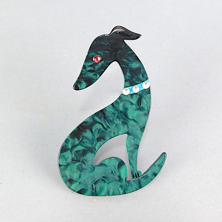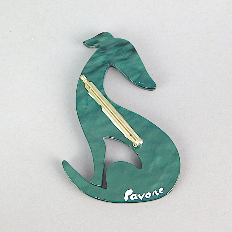 French vintage galalith hand made and signed brooch by Marie-Christine Pavone. It has diamonte collar detail. Fitted with a roll safety clasp.