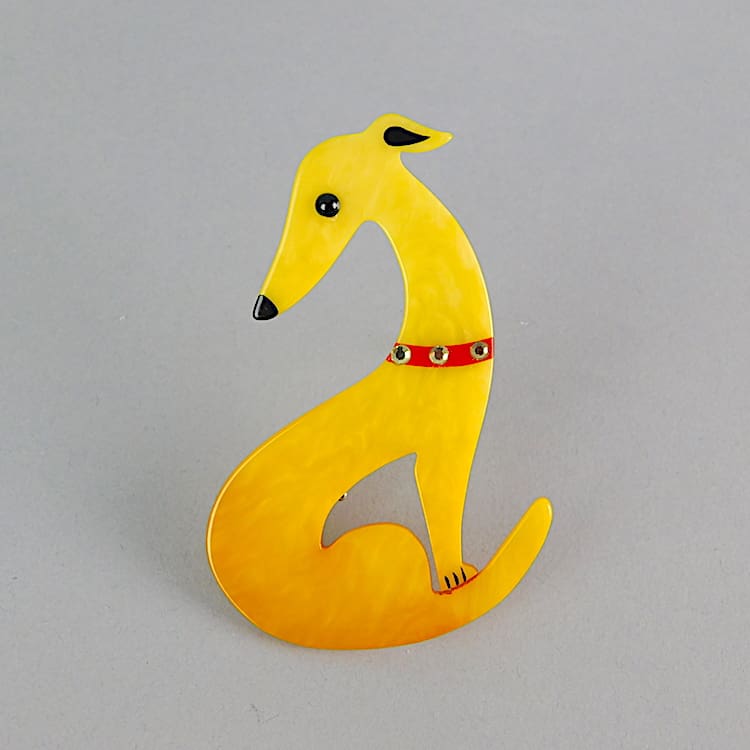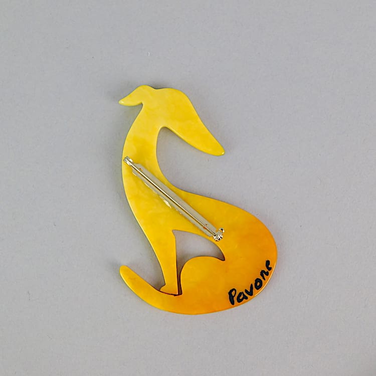 French vintage galalith hand made and signed brooch by Marie-Christine Pavone. It has diamonte collar detail. Fitted with a roll safety clasp.
