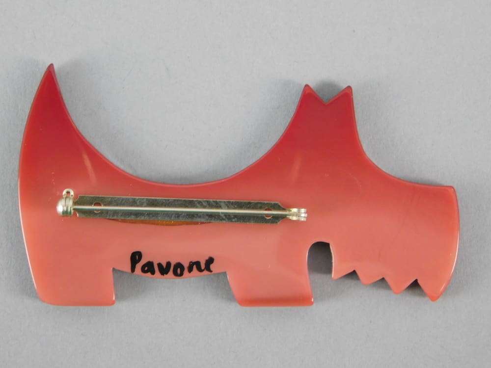 Chien Raoul Brooch by Pavone. French vintage galalith hand painted dog brooch by Marie-Christine Pavone. Signed to the back and fitted with a roll safety clasp.