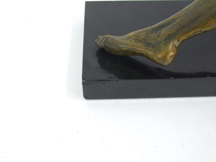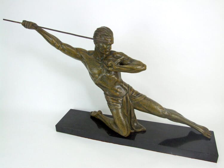This huge French spelter male warrior is an unsigned Chiparus, It has an green-bronze patina and the base is of Belgian Black marble.