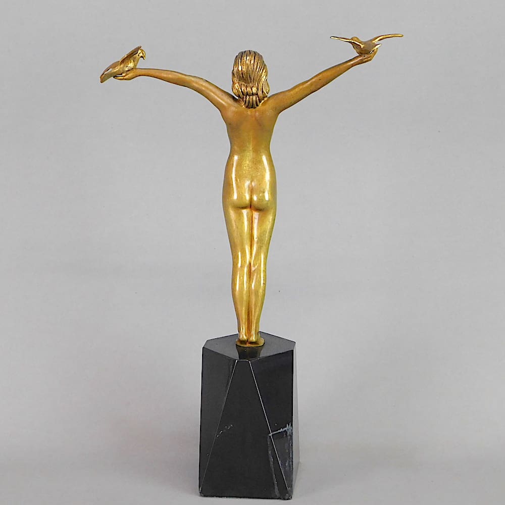 Gilt patinated and mounted on a faceted black marble base.