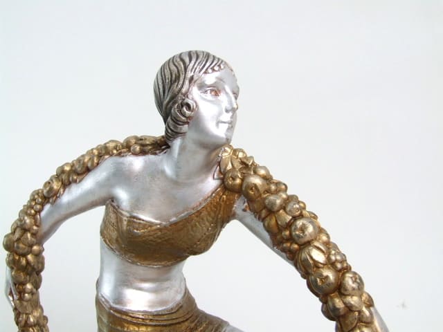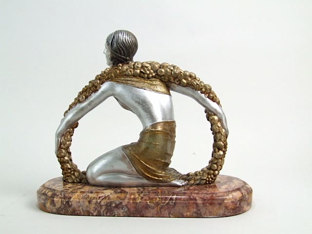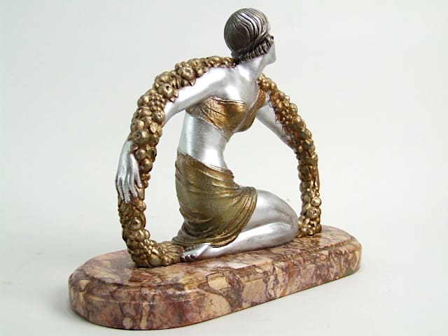 A French spelter art deco statue of girl with a garland, an unsigned Chiparus . I have never seen another of this figure, it is unsigned but undoubtedly by Chiparus.