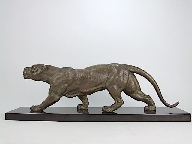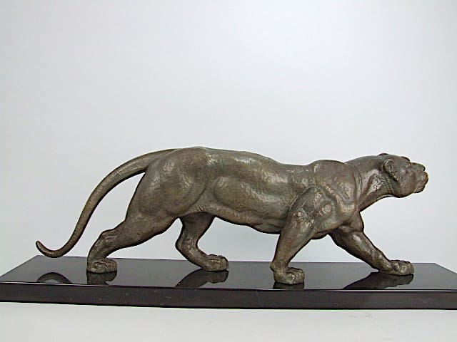 A signed spelter panther by D. H. Chiparus and signed to the black marble base.