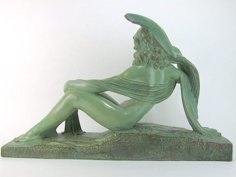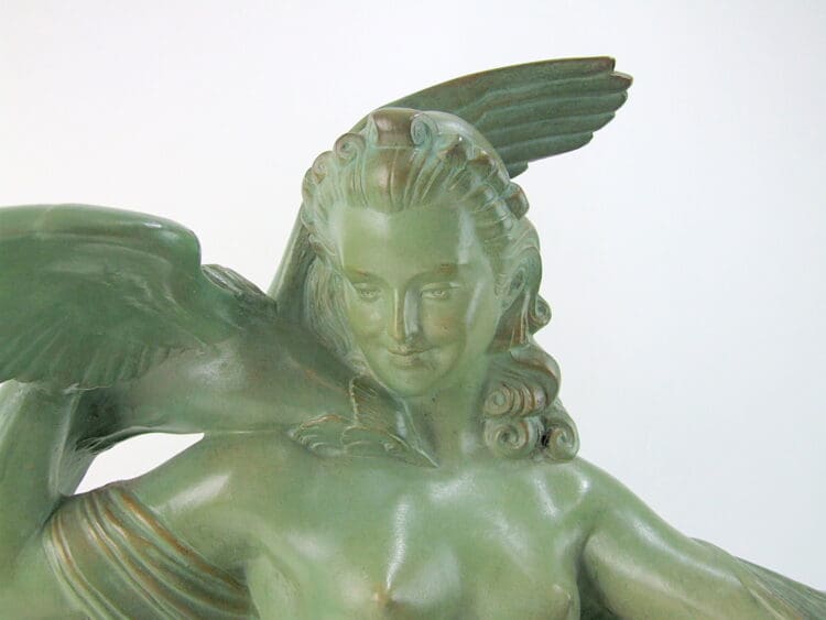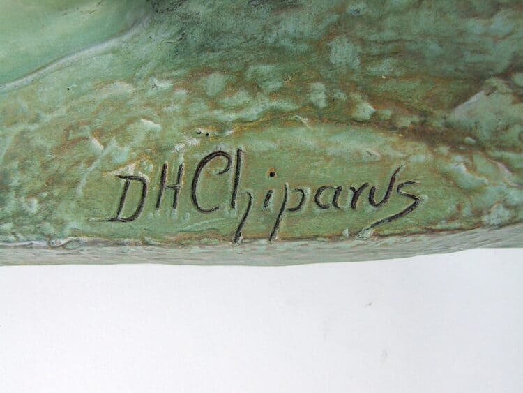 French art deco terracotta lady and bird statue by Demetre Chiparus. Signed D. H. Chiparus to the base.