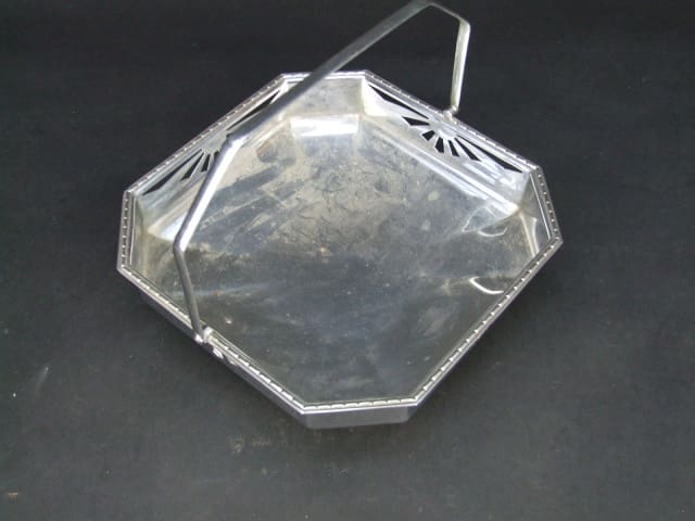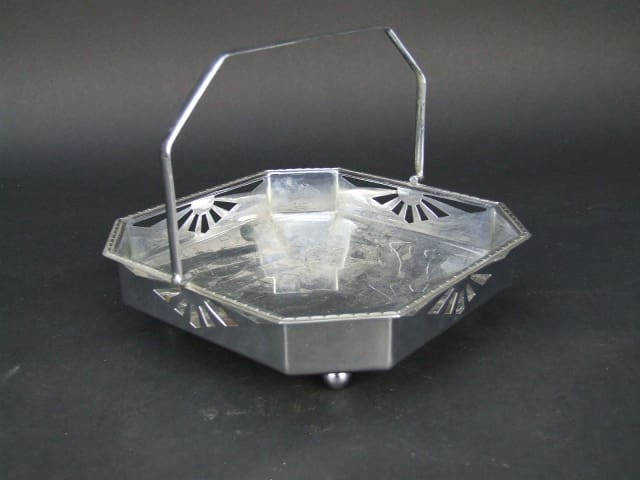 English Fruit basket with sunray cut outs to the sides. Marked Crusader and stainless steel to the base.