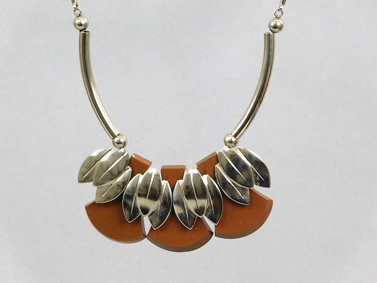 Brown galalith and chrome leaves modernist necklace. Made in the early 1930’s by the Jakob Bengel factory.