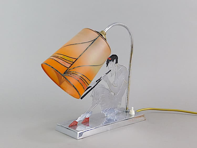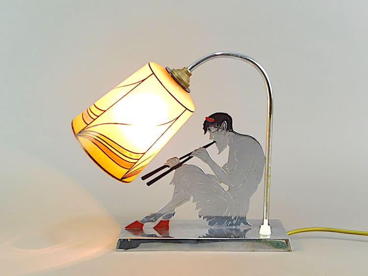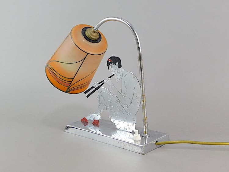 A French chrome silhouette satyr (or Pan) lamp with makers initials stamp underneath, looks like YV Paris. Hand painted glass shade.
