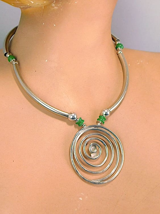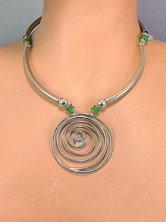 Unusual spiral pendant with green galalith beads and long chrome tubes.