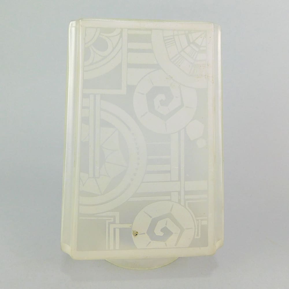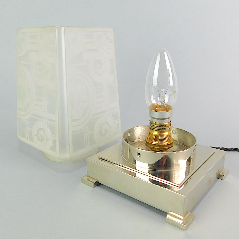 French Art Deco modernist table lamp with geometric frosted class shade. Chromed bronze metal stand.